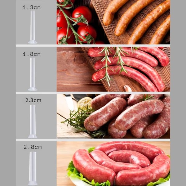 Obsahuje 4 vyměnitelné trysky (1,3 cm, 1,8 cm, 2,3 cm, 2,8 cm), takže můžete připravovat klobásy a salámy v různých velikostech – od malých a vhodných na svačinu po velké a syté.